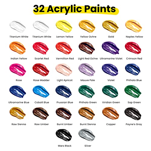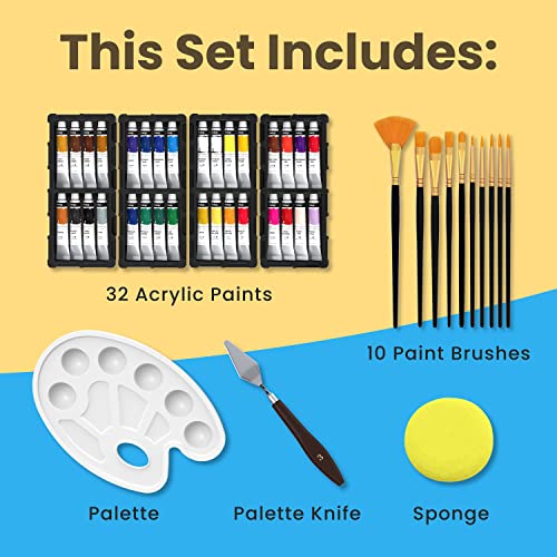 Acrylic Painting Supplies – High quality, easy to use & store acrylic paint sets – This acrylic craft paint set has 32 Individually labeled Aluminium acrylic paint tubes, 10 Painting brushes, 1 Palette, 1 Paint knife & 1 sponge.